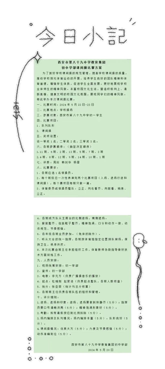 人间五月天,浅夏胜春烟。为落实体育常规,增强学生体质,提升学生集体荣誉感和团结拼搏精神,展示积极向上的班级精神风貌,2024年5月22日—23日下午,西安市第八十九中学教育集团初中学部课间操比赛如约而至。