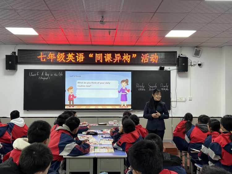 围绕七年级语文《我的白鸽》、数学《“整体思想”在数学中的应用》、英语《Unit6 Project》和八年级物理《物质的三态 温度的测量》四个课题,两校的八位老师对教材内容进行了各具特色的分析和处理,呈现出了不同的教学风格。她们执教的公开课,课堂精彩纷呈,课堂气氛热烈充分,学生和老师之间的默契,激起了思维的火花,让在场的老师们都感受到了“同课异构”的魅力。