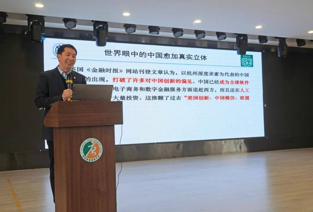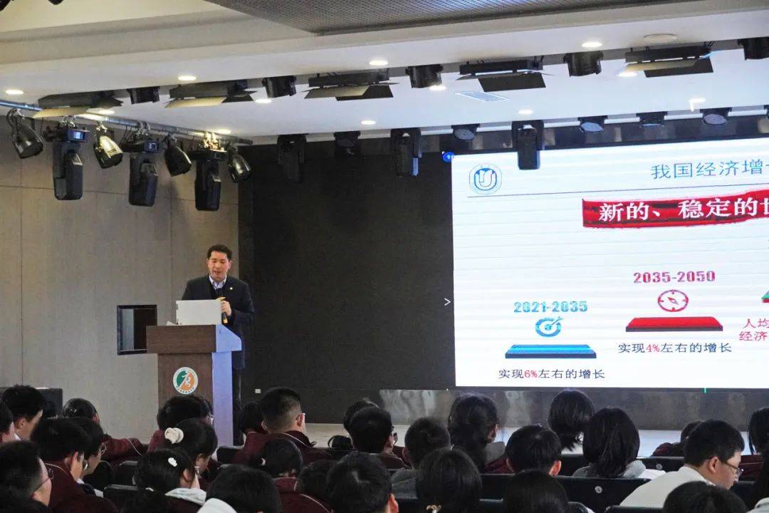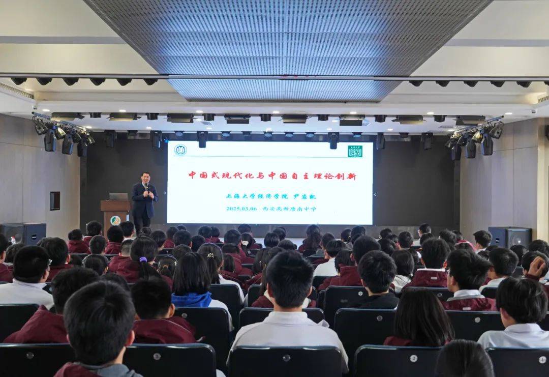 座谈会后,上海大学经济学院党委书记尹应凯为高一年级同学做了一场题为《中国式现代化与中国自主理论创新》的讲座。尹书记结合当下时政、经济、科技热点话题,从中国式现代化解读、中国经济发展回顾与展望、中国式现代化呼唤自主理论创新、青年担当等方面,为同学们深入浅出地剖析了中国式现代化和中国自主理论创新的题中之义。