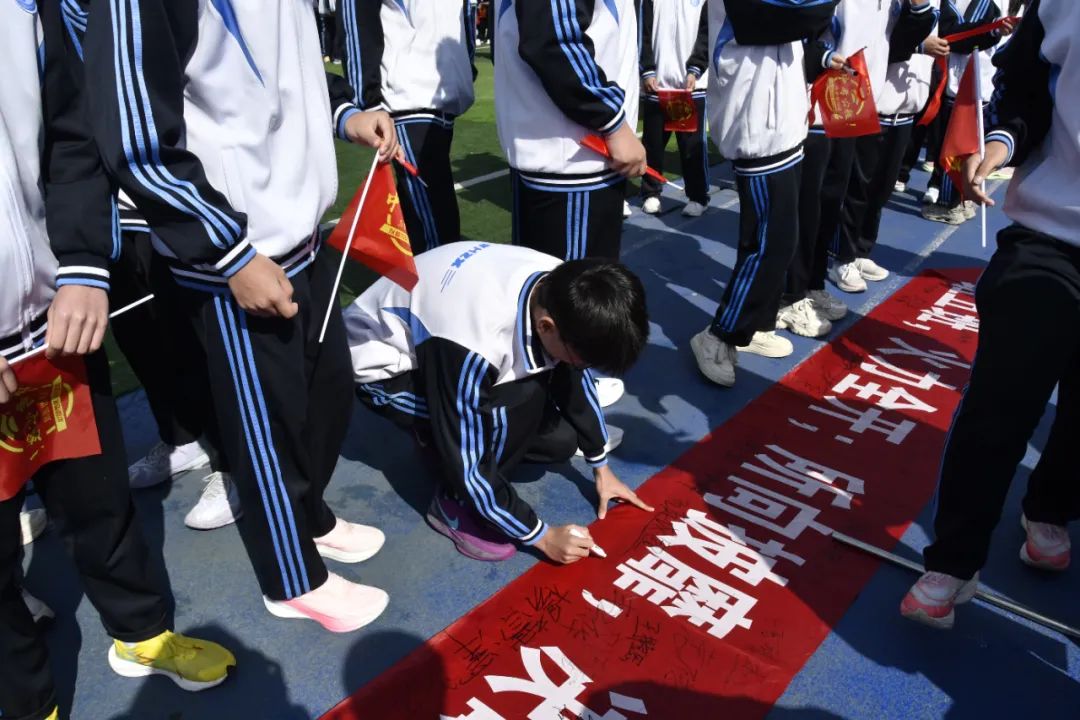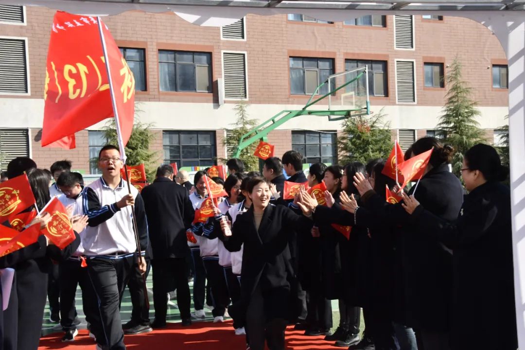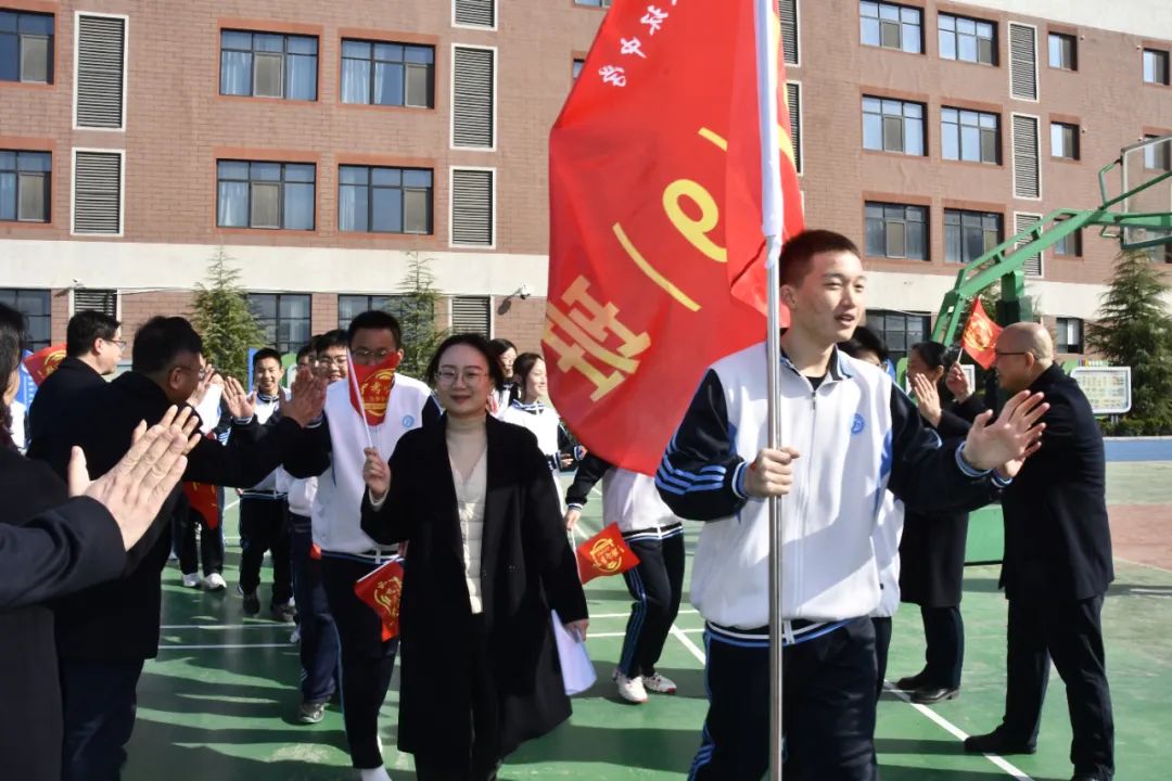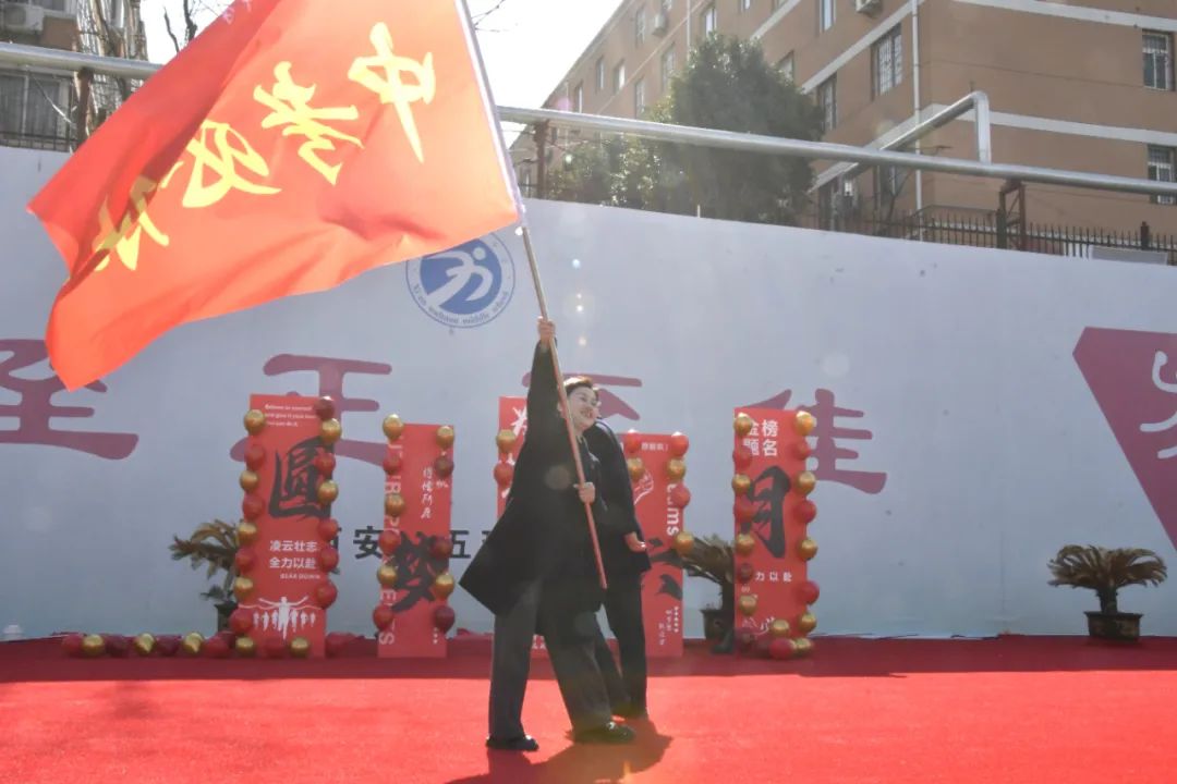 副校长魏涛为九年级各班授旗。十八面旗帜承载着学校对同学们的希望,凝聚着对大家未来的坚定信念。同学们高举这面旗帜,在未来的100天里,大家以必胜的信念迎接挑战跨越难关,向着胜利的彼岸奋勇冲刺。