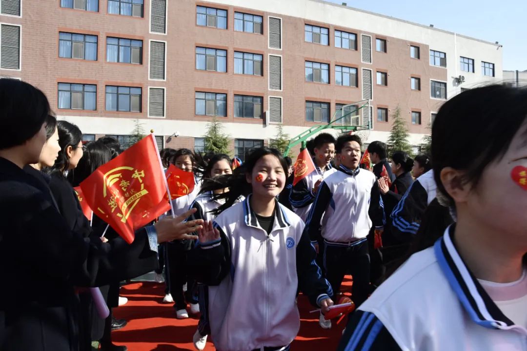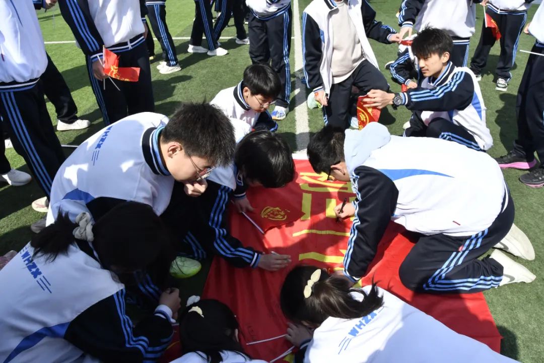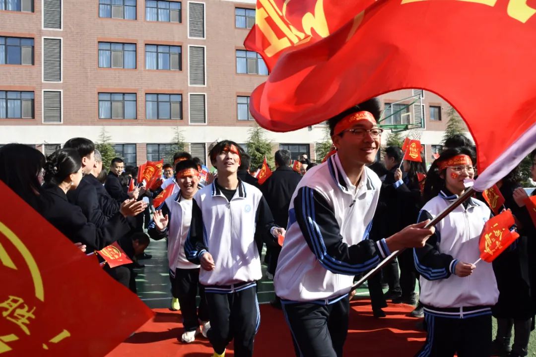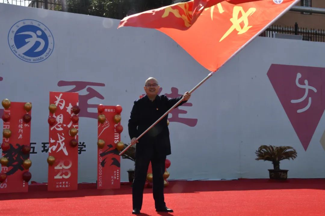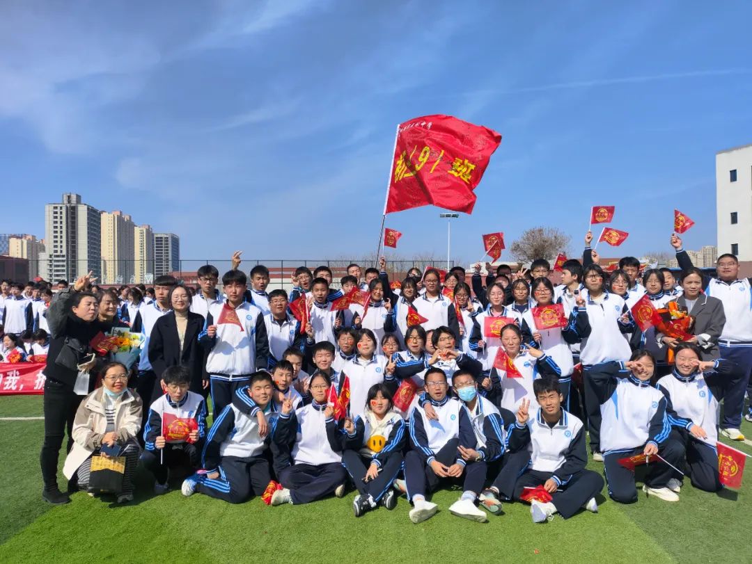 副校长魏涛为九年级各班授旗。十八面旗帜承载着学校对同学们的希望,凝聚着对大家未来的坚定信念。同学们高举这面旗帜,在未来的100天里,大家以必胜的信念迎接挑战跨越难关,向着胜利的彼岸奋勇冲刺。