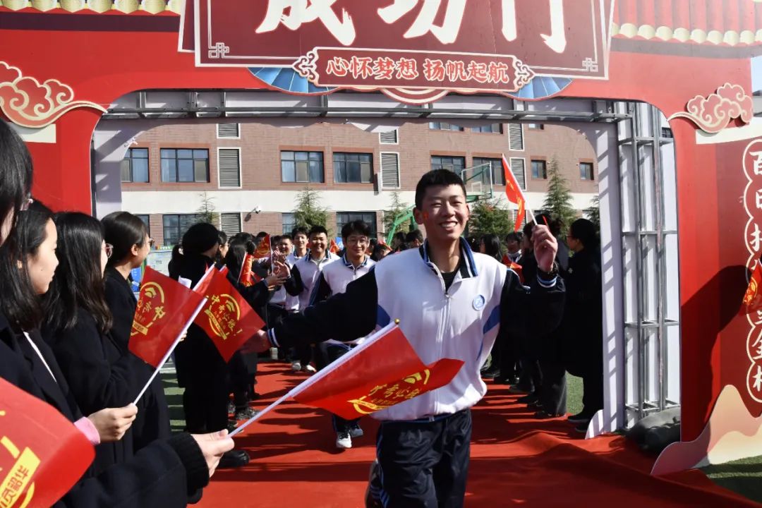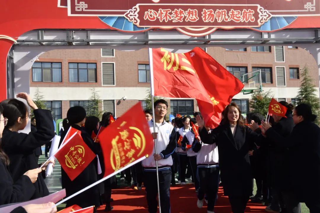 “燃烧吧,骄傲的少年……”九年级全体同学伴随着热血青春的歌曲与激昂的鼓点声入场。鼓点如雷,旗帜飞扬,展现出学子们勇往直前的气势。
