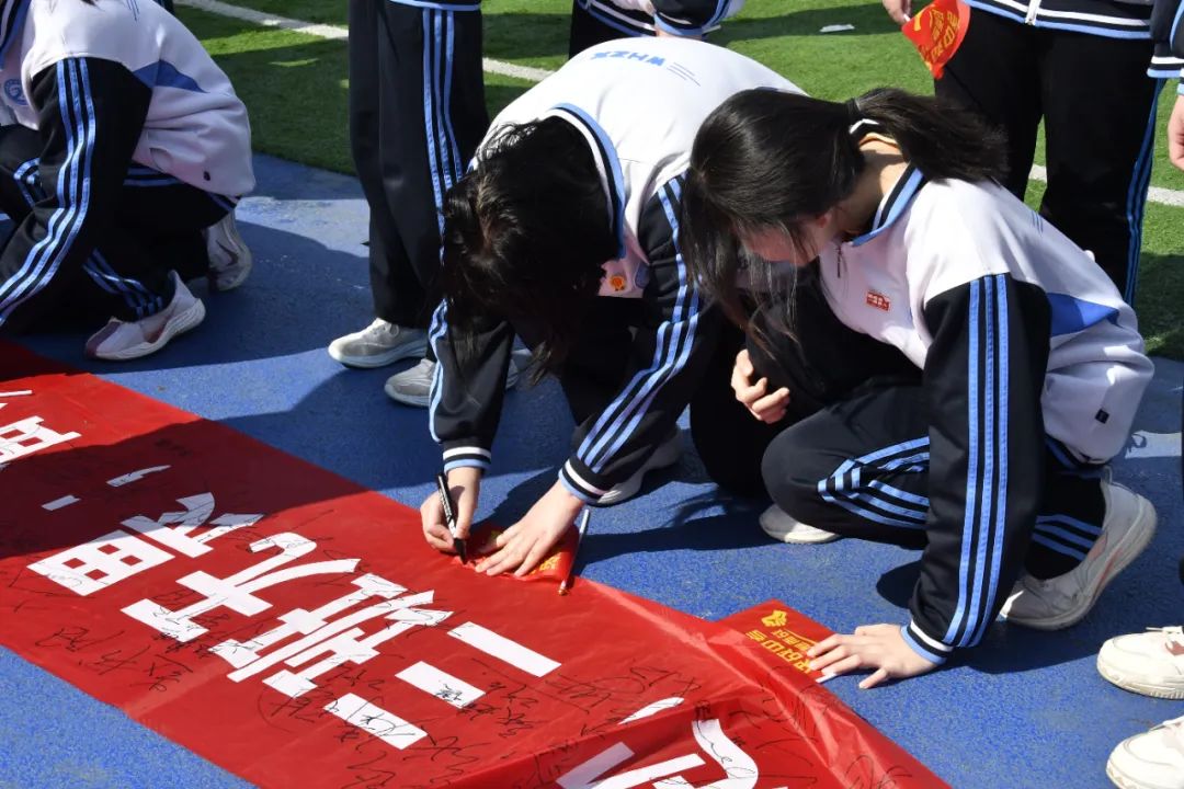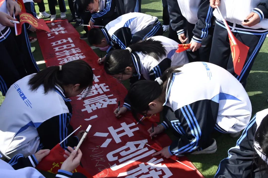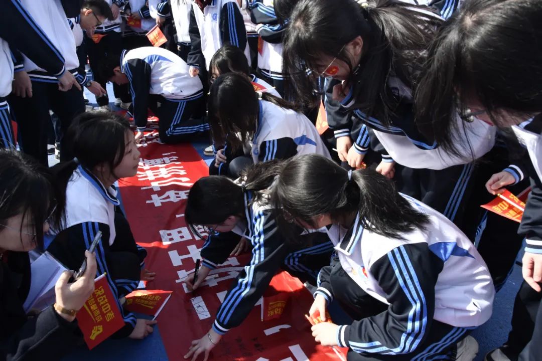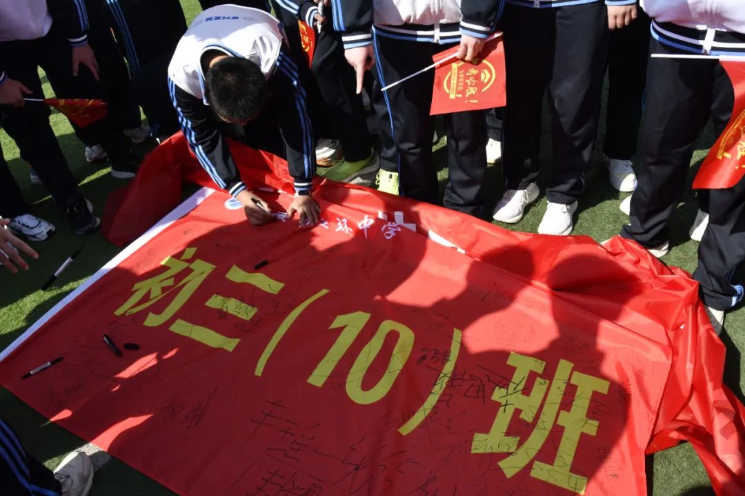 笔墨签下的,是我们的决心与信念。”校领导、学生家长代表、全体九年级老师、同学们在横幅上签名,为初三的勇士们。