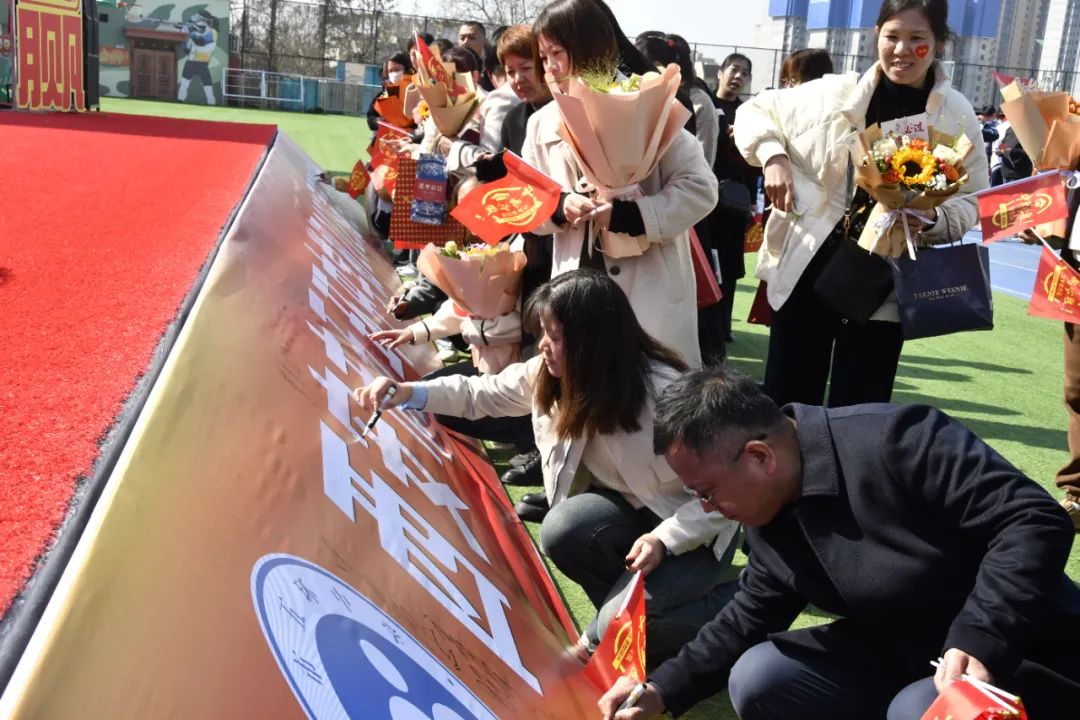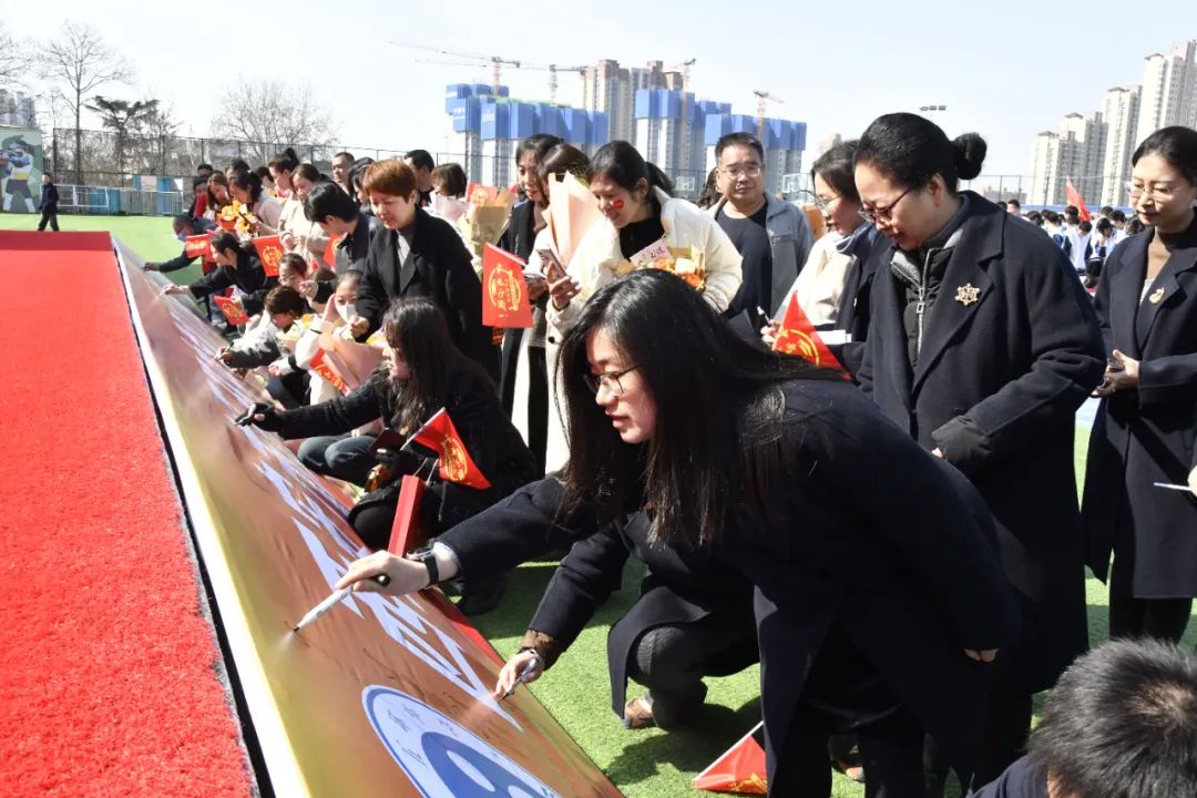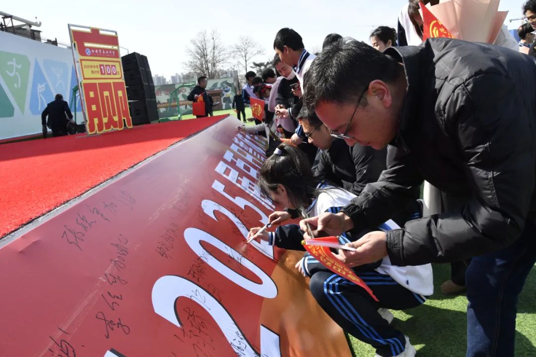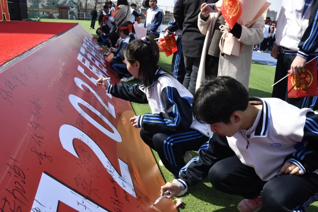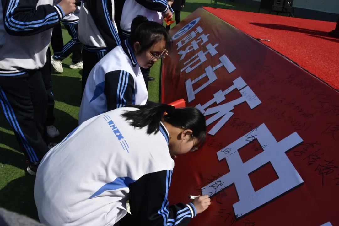 笔墨签下的,是我们的决心与信念。”校领导、学生家长代表、全体九年级老师、同学们在横幅上签名,为初三的勇士们。