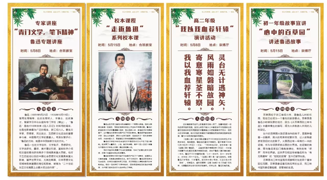第三乐章:课程篇。在崇文书院青门文学社开展“青门文学、笔下精神”鲁迅专题讲座。在初、高中开展“走近鲁迅”系列校本课程,走进鲁迅人生大讲堂,带领学生一同凝视孔乙己的长衫,赏读鲁迅笔下的人物;一起探寻鲁迅的人生故事、鲁迅的少年时光、鲁迅的“五四”风云。这一乐章通过引领师生寻鲁迅足迹、建校本课程,铸中华民族脊梁。