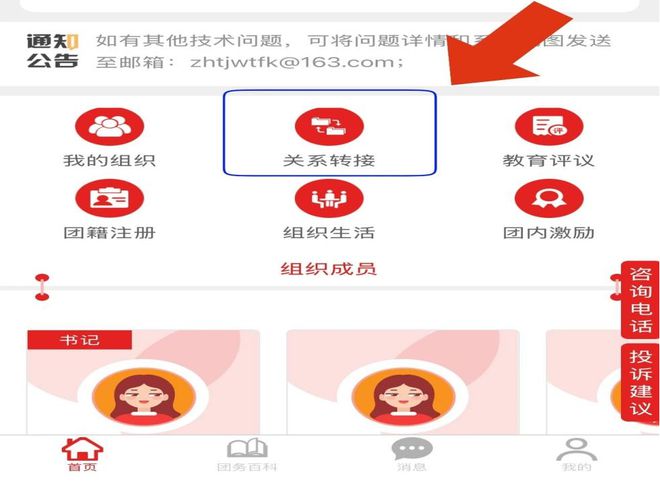 2.进入主页,点击进入关系转接,选择申请转入组织,转出组织及转出原因,等待管理员审核通过转出申请。