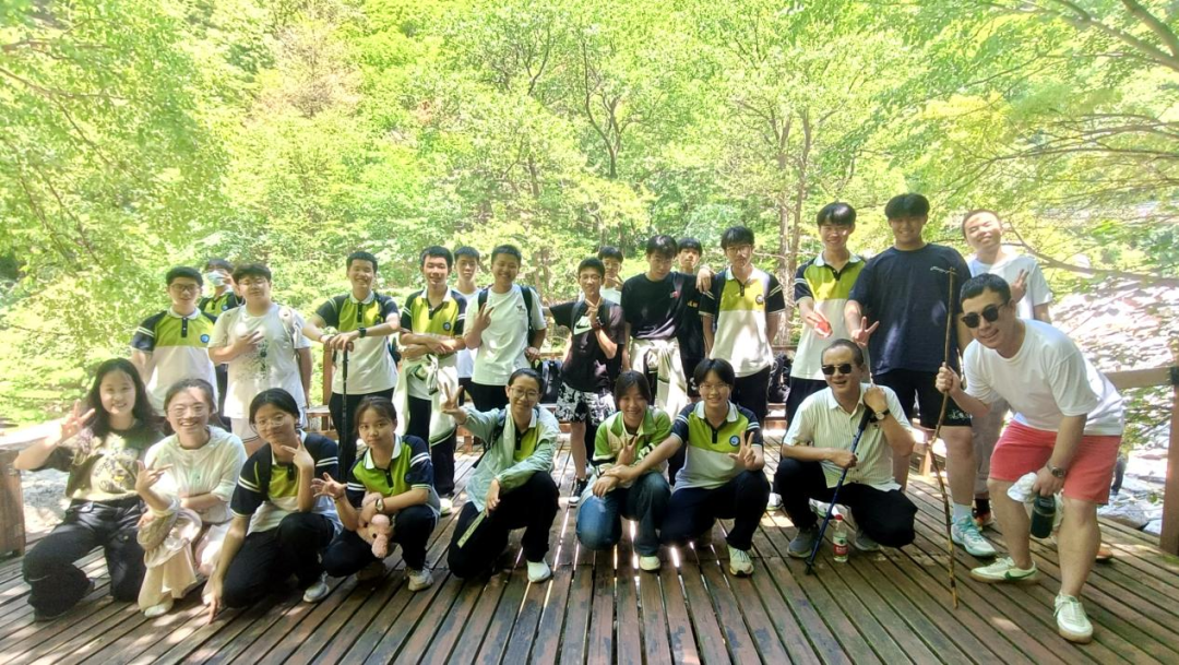 清晨的青峰峡云雾缭绕,薄雾未散,步道旁的溪流叮咚作响。沿林间步道前行,草木葱郁,溪流潺潺。师生们在欢声笑语中向“青峰飞瀑”进发。沿途中,青灰色花岗岩,千万年风化形成的陡峭山吸引同学们的注意,不时蹲下身触摸岩石,用手机拍摄不同岩层的纹路。经过几小时攀登,一道银练般的飞瀑出现在众人眼前,“青峰飞瀑”从30米高的崖壁奔涌而下,溅起的水雾在阳光下折射出彩虹,令学生们驻足欣赏。