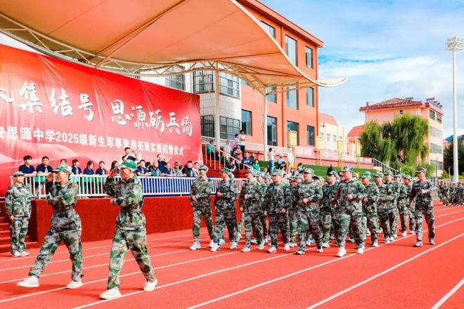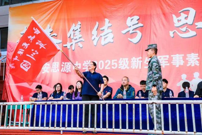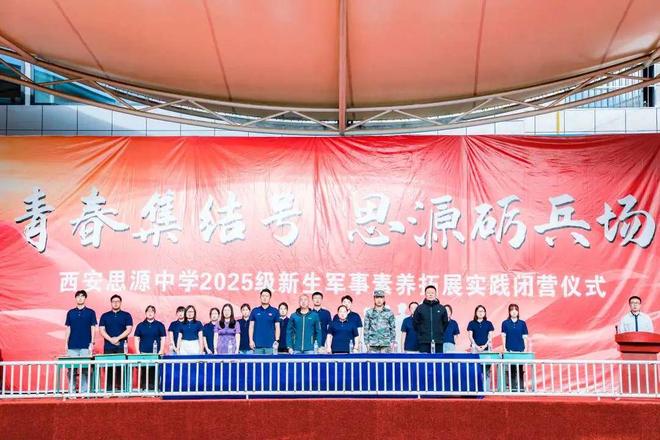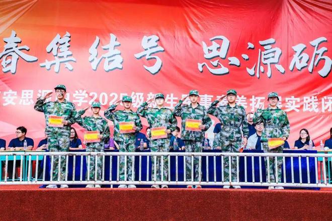 迷彩作裳,汗水为章。历经一周的骄阳淬炼与风雨洗礼,学校2025级新生军事素养拓展闭幕式于2025年8月24日在西安思源学院太白体育基地正式举行。高一年级参训新生以最昂扬的姿态,为这段热血沸腾的青春征程画上圆满句号。参加本次军事素养拓展实践的有西安思源中学党总支书记、校长王琪,西安思源学院体育学院院长钟华,西安思源学院太白体育基地主任李山,西安思源学院太白体育基地副主任罗翠霞,军训团团长王庚,西安思源中学党总支副书记、副校长王强,德育处副主任李刚,高一年级中心主任马欠欠及2025级全体班主任。闭营仪式由西安思源中学党总支副书记、副校长王强主持。