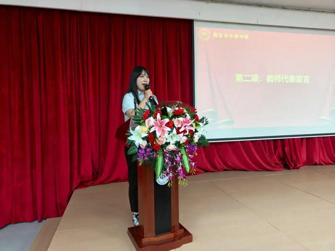 李博维老师作为教师代表发言,她回顾了教师们以热爱坚守初心、以奉献诠释担当的日常点滴,呼吁大家以赤诚之心温暖学生、照亮未来。