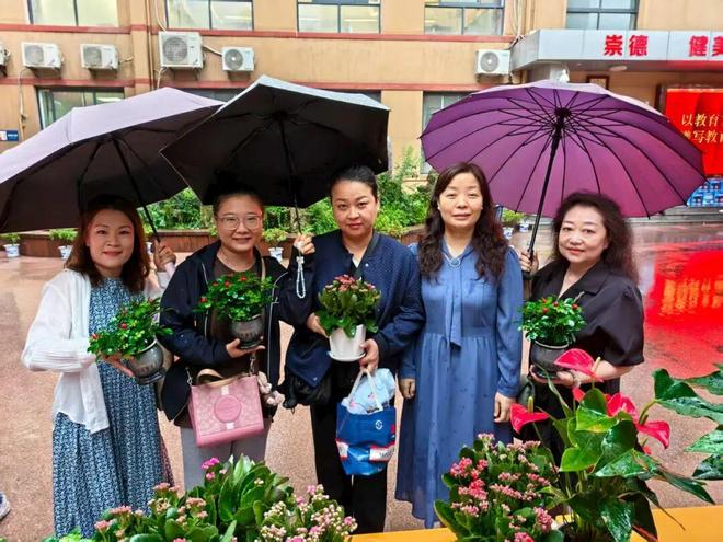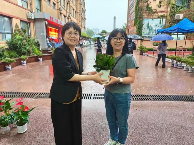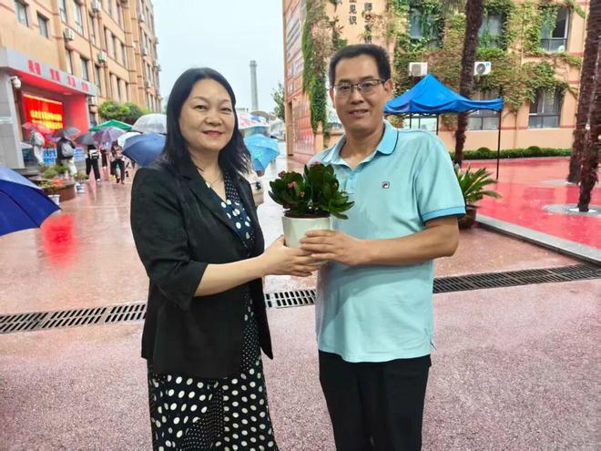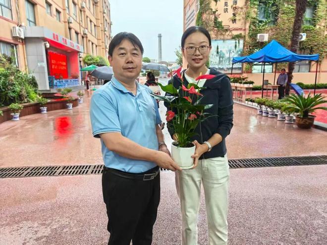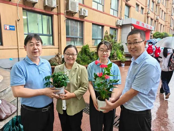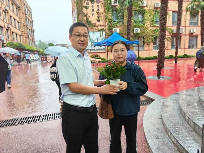 清晨,校领导们早早来到学校,他们手捧盆栽,为辛勤耕耘在教学一线的老师们送上真诚的祝福。
