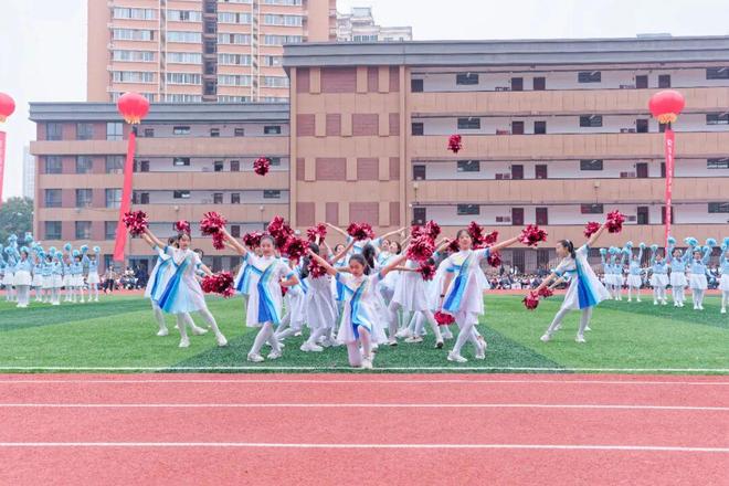 初一年级同学的啦啦操《我与祖国共飞扬》活力绽放,初二年级同学的绳操《光之弦 绳蹁跹》灵动轻快,将日常课间阳光体育的成果尽情展现。