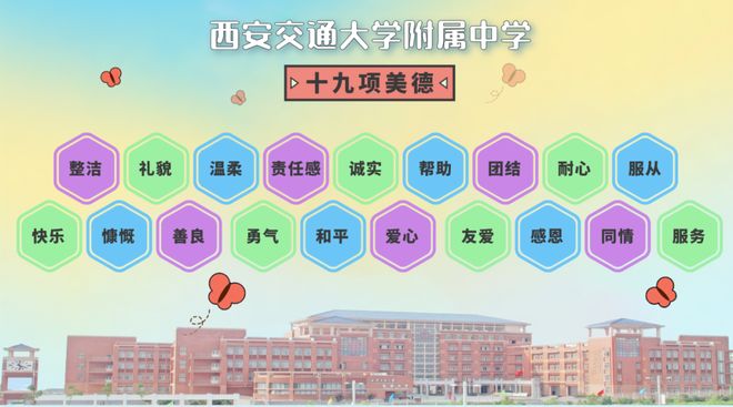 西安交大附中空港实验学校秉承西安交大附中“砥砺第一等品行,造就第一等人才”的育人宗旨,高度重视学生的良好品行与礼仪修养,持续在全校深入推进十九项美德教育。