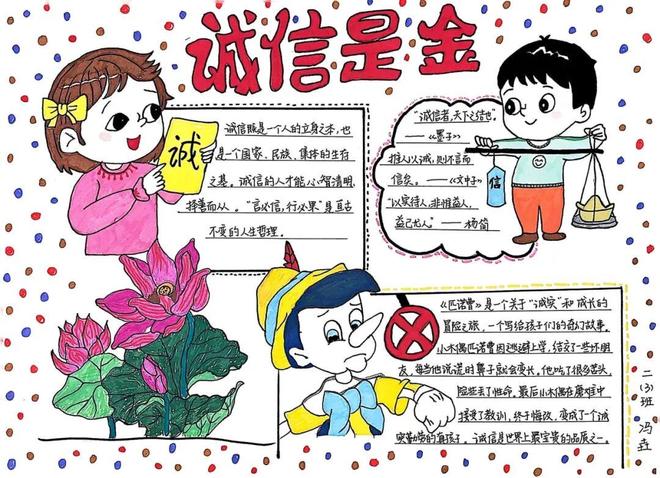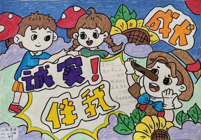 二年级同学以手抄报的形式阐释诚实,不少作品都以匹诺曹为例,生动地提醒同学们:诚实是每位学生都应具备的品德。