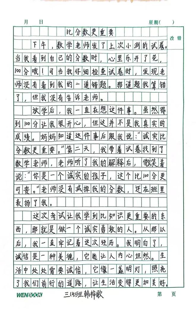 三年级的韩梓歌同学用亲身经历告诉同学们:诚实比分数更珍贵。