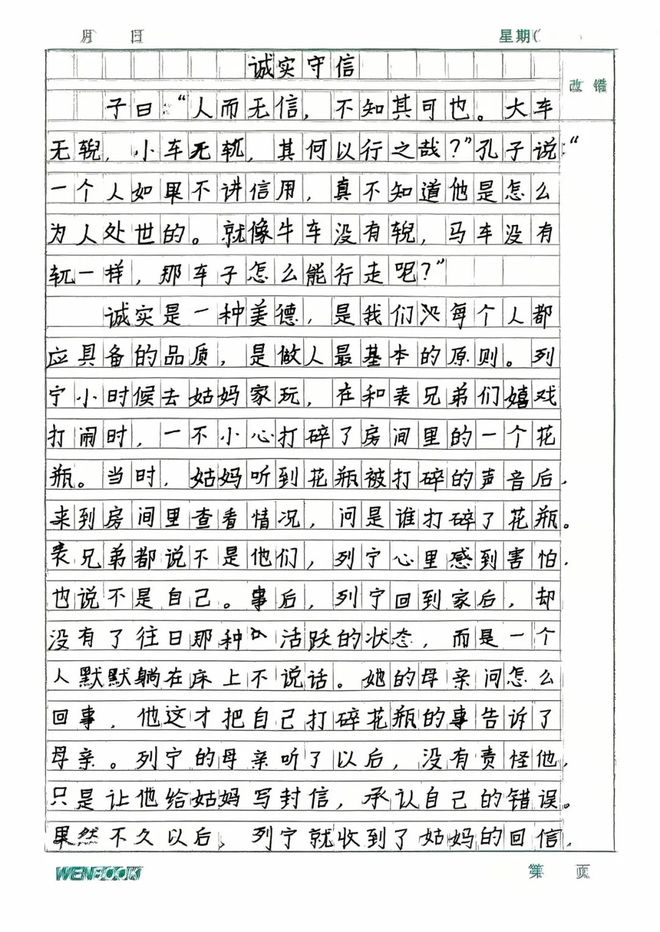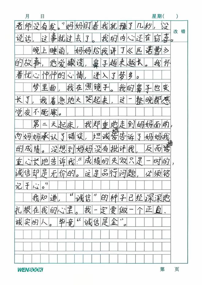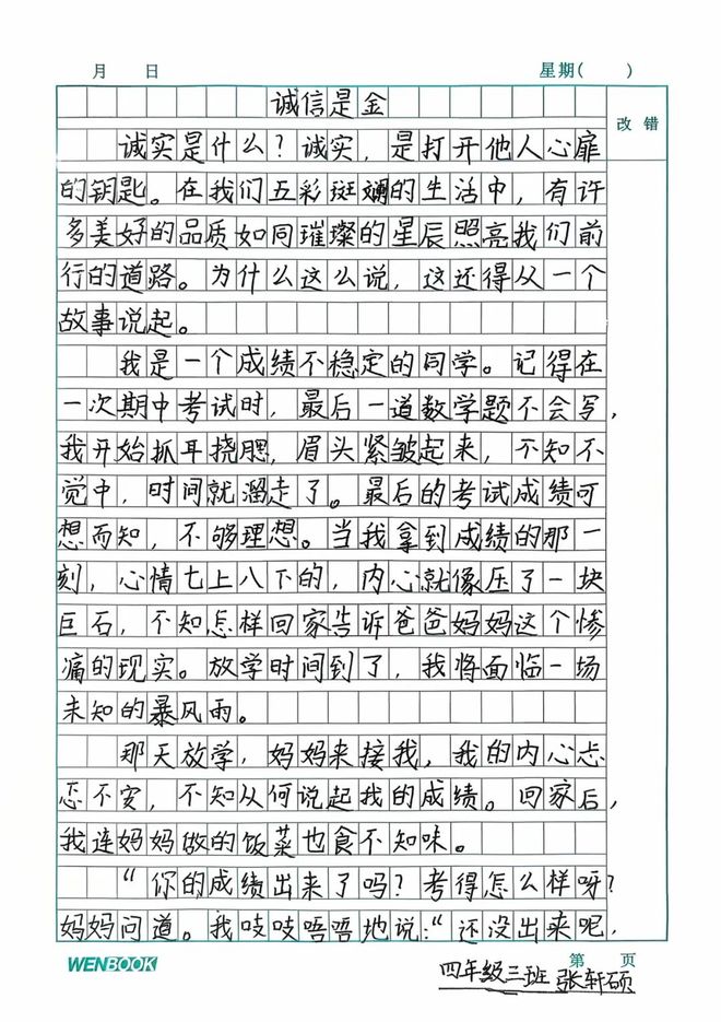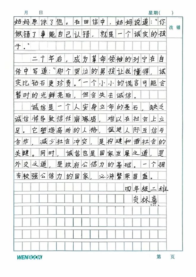 四年级的贠林熹同学在文章中写道:“诚实是一个人安身立命的基石”,道出了诚实的珍贵价值。